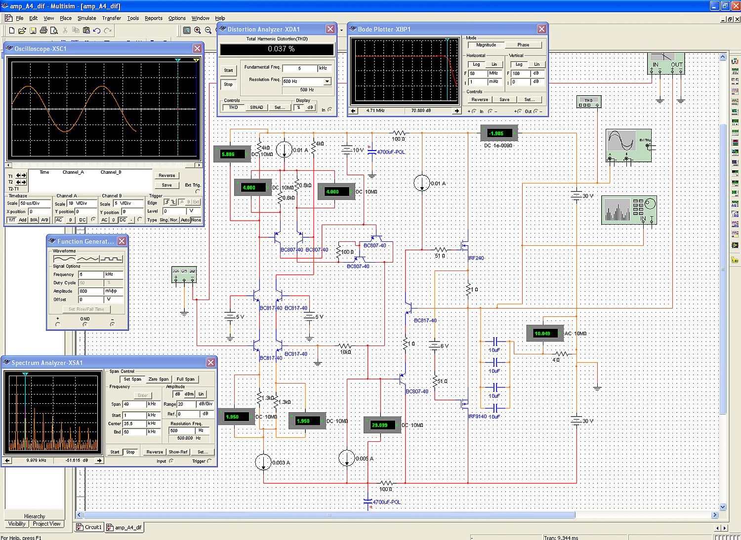 Мультисим спектрограмму рисует странно. Когда курсор подвидишь то пишет, что все четные гармоники как минимум на 15 дб больше нечетных, а рисует их одинаково попарно.. странно ;) короче надо в железе паять.