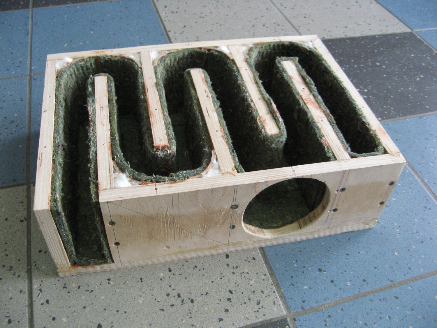 Что подтвердилось и моими экспериментами. Был сделан небольшой лабиринт на 13 см динамике со скругленными поворотами и заполнением.