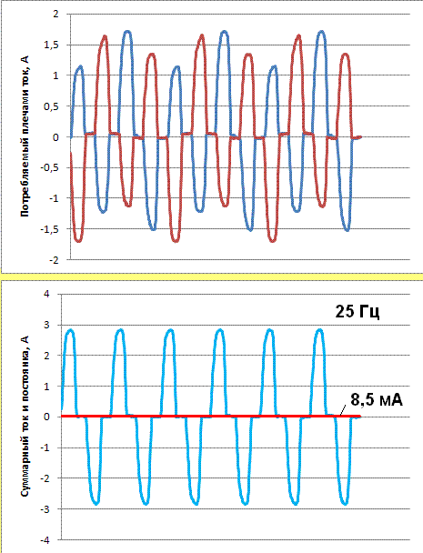 4. Подмагничивание происходит как в схеме выпрямителя со средней точкой и одним общим диодным мостом, так и в схеме с отдельными обмотками трансформатора и отдельными мостами в каждом плече. С точки зрения подмагничивания схемы не эквивалентны, но оно есть везде.