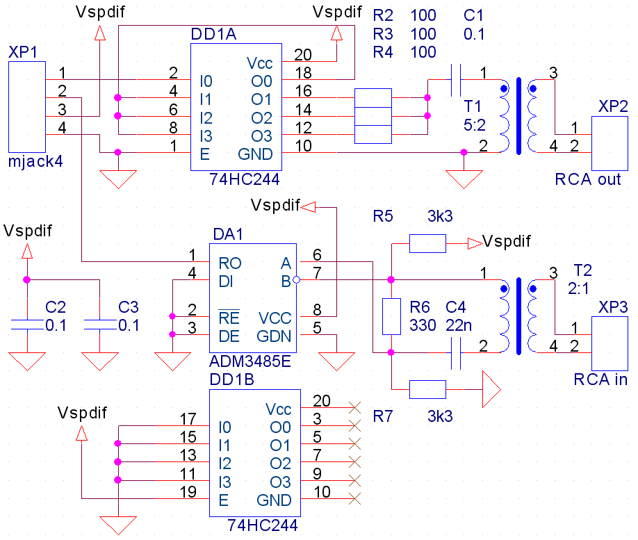 Мне очень понравился вариант на 74хх74, его Никитин предлагал: автоматом пересинхронизация SPDIF выхода, симметрирование помех по питанию и более удачная работа с трансом. ИМХО. Сам делал на ад1485 и 74hc244 (один буфер повторителем-усилителем, а три канала работали на транс). Второй вариант дешевле , а по качеству соизмерим с первым. ИМХО