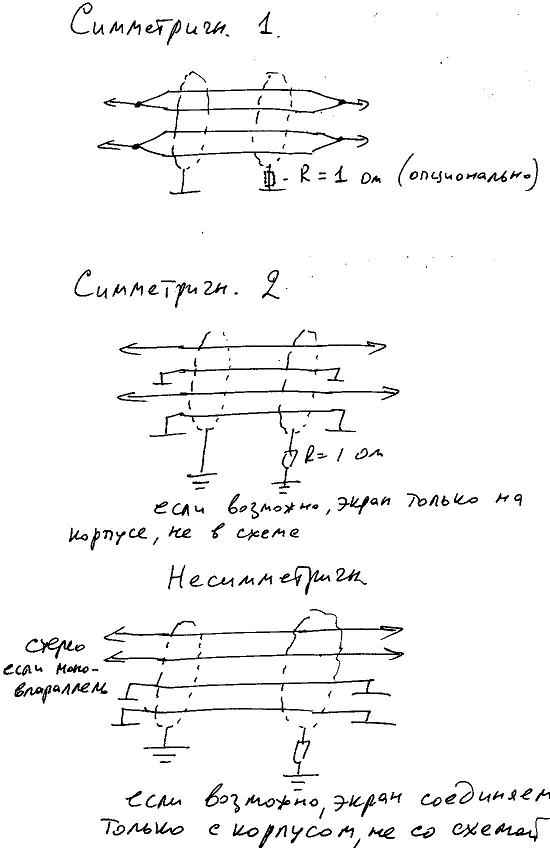 При попытке соединения симметричным кабелем приборов с электронной симметрией, вопреки ожиданиям, в некоторых случаях, наблюдалось увеличение фона или помех другого рода.