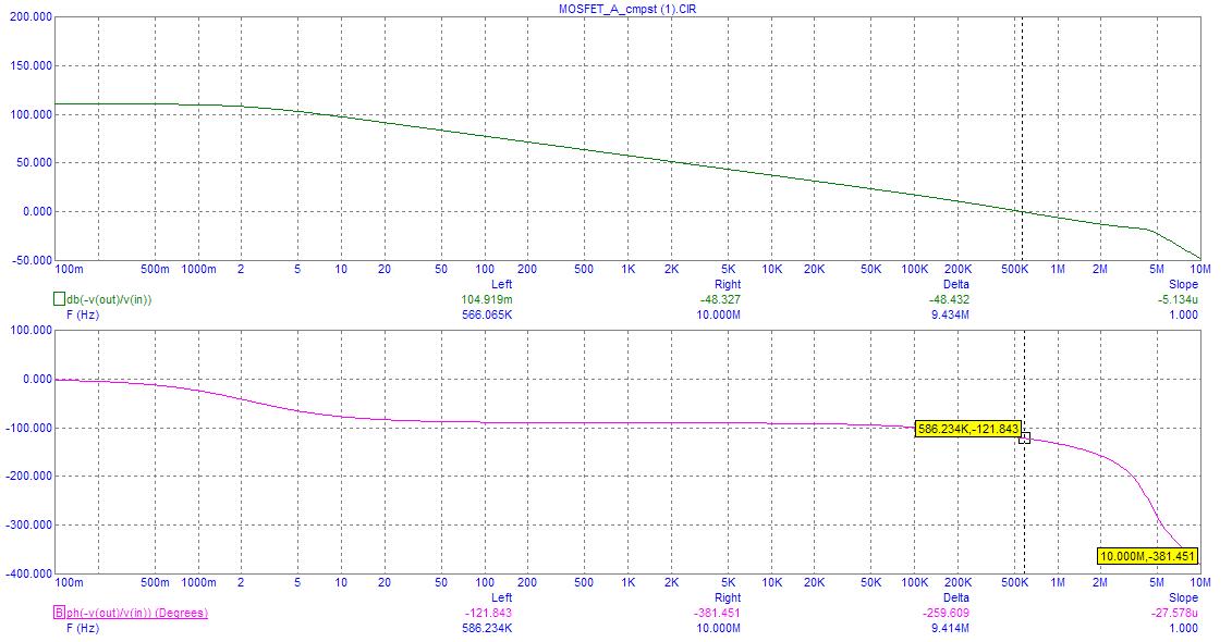 В той схеме нет разделительного конденсатора. А ФНЧ убирать нельзя, он является частью ОС. Выброс на ПХ будет и при 60-ти градусном запасе по фазе. И разве это плохо? Вот график петлевого усиления при нулевом смещении. Видно, что запас по фазе как раз 60 градусов, как и должно быть в идеале.