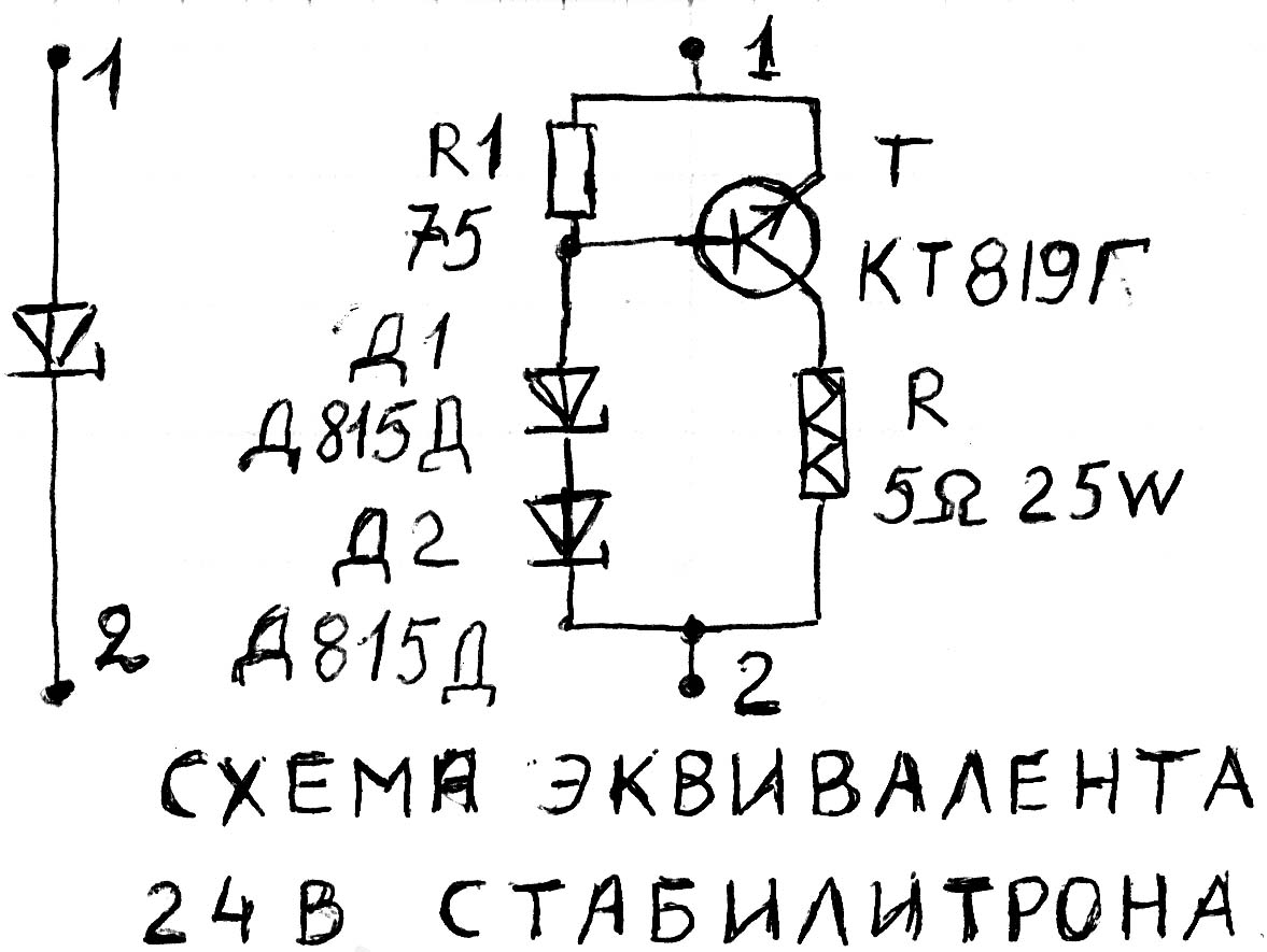 Добавлено 08.09.2012.г. В связи с имеющимися желаюшими повторить конструкцию, для начинающих привожу эквивалент мощного стабилитрона на 24В.