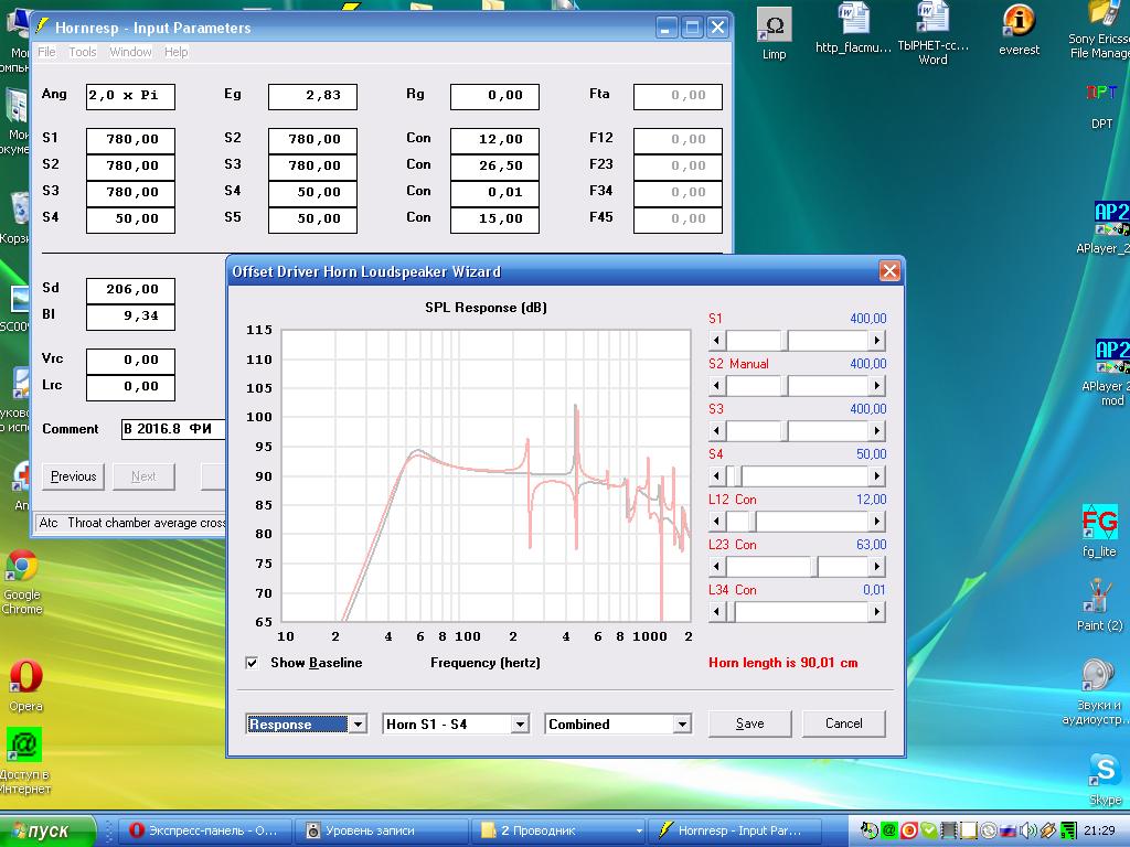 Подписал скрины "бочка" (короткий большой площади сечения) и "труба". №4 - Черным - график по параметрам из главного окна. 780 площадь сечения , 38 см длина. Красным - согласно сдвинутым ползункам.Нажмите на изображение для увеличения.
