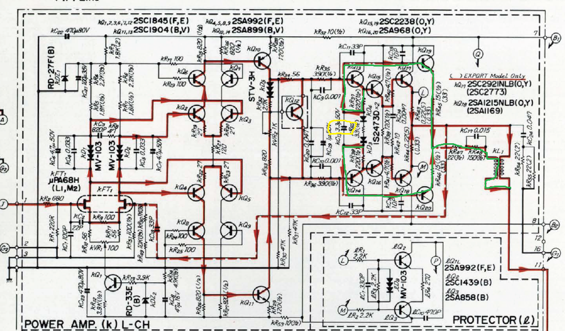 Сам по себе усилитель работает в классе Б, зелёным отмечен путь сигнала дополнительного маломощного усилителя (error correction amplifier), вот он, кстати и сдох почему-то в одном канале. Сейчас причины уже не установить.