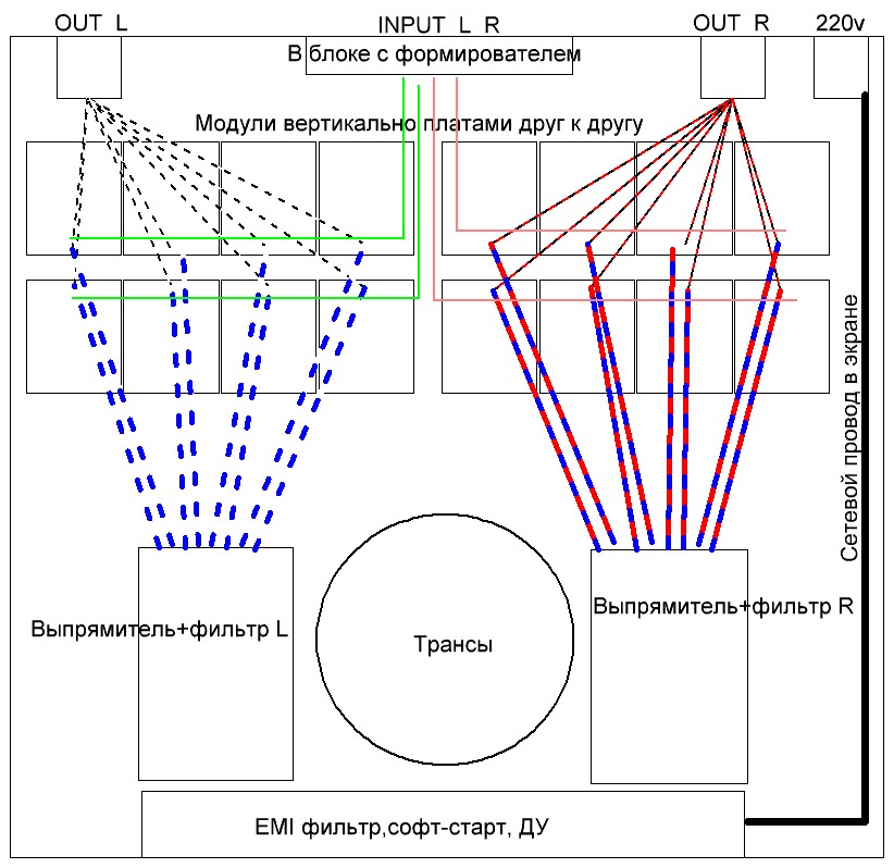 Т.е. питание витыми парами кратчайшим путём к модулям. От модулей витыми парами выходные проводники к выходным разъёмам (по правому и левому краям задней стенки) Т.е. кратчайшие пути тоже вроде получаются