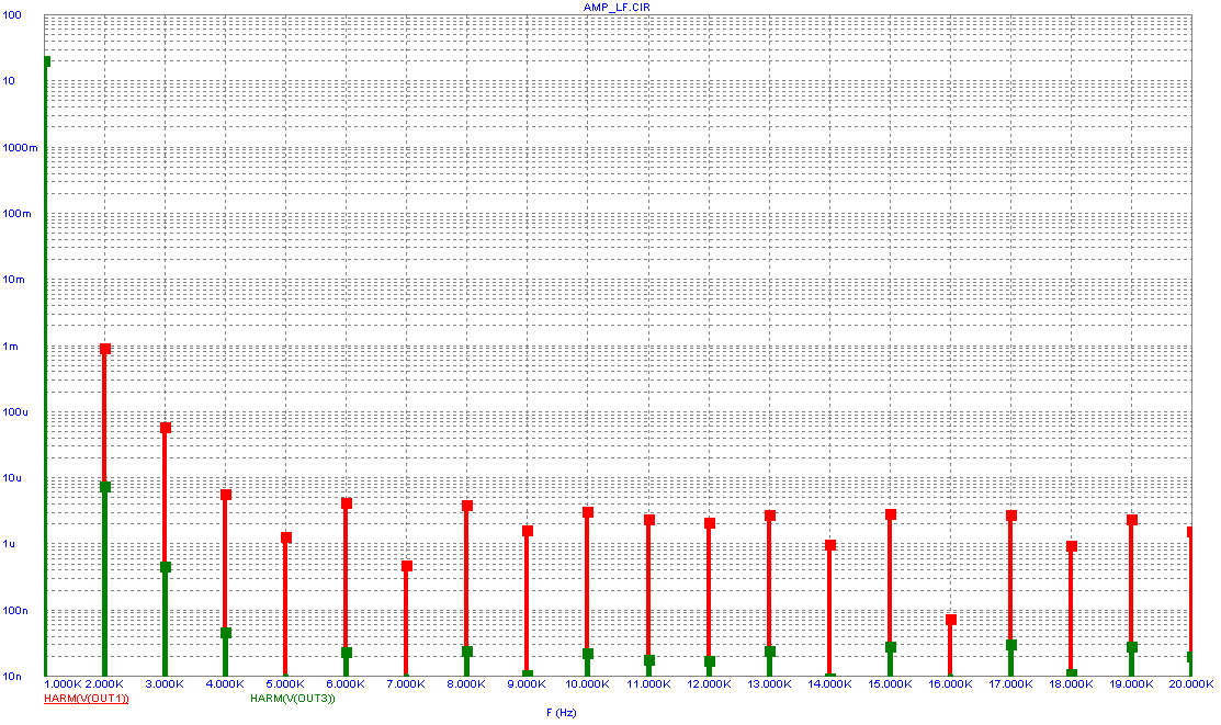 Во вложении приведены спектры гармоник для схемы поста #1 (красным) и несколько измененной схемы(зеленым). В измененной схеме добавлено 2 транзистора, изменены токи покоя предвыходных транзисторов ВК для увеличения скорости нарастания до 15 В\мкс, изменены номиналы коррекции. Топология осталась прежней.