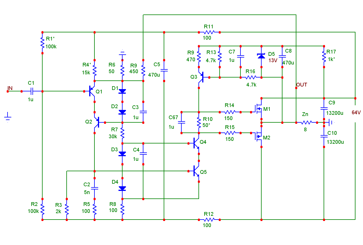 При питании 64 В и выходных транзисторах IRF940, IRF9540 (на макете, ток покоя выходников 40 мА) выходная мощность 40 Вт\8Ом, 80 Вт\4 Ом.