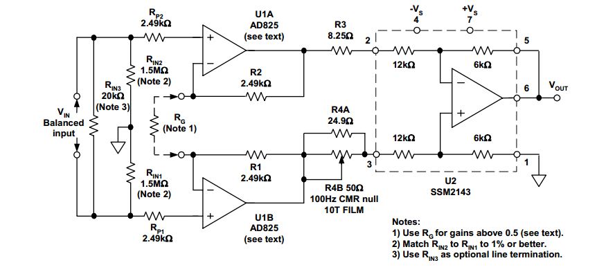 Иначе, если нужен малый шум, то остаются только два варианта - классические 2 повторителя перед диффусилителем "на одном ОУ с 4 не слишком высокоомными резисторами вокруг" (т.е. аналог THAT120x), или то же самое, но с диффусилителем на 2 ОУ в инвертирующем включении (чтобы избавиться от синфазного напряжения на ОУ).