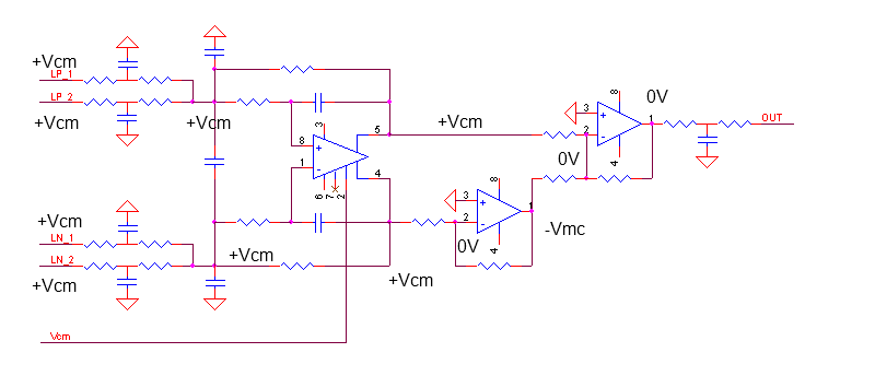 В выходном каскаде, +Vcm с выхода FDA суммируется с -Vcm с выхода инвертора, уничтожая друг-друга.