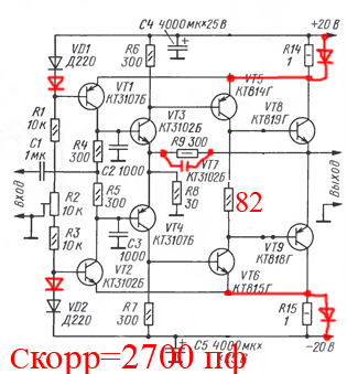 Еще подумал... выкидываем нафиг транзистор термостабилизирующий (он тут уже не нужен, ООС по току снимаем с коллекторных резисторов выходников), заменяем его на межбазовый резистор ~100-150 Ом. И мне так кажется, обе цепочки из 2-ух диодов вовсе необязательно будет ставить на общий с оконечниками радиатор. Красота!