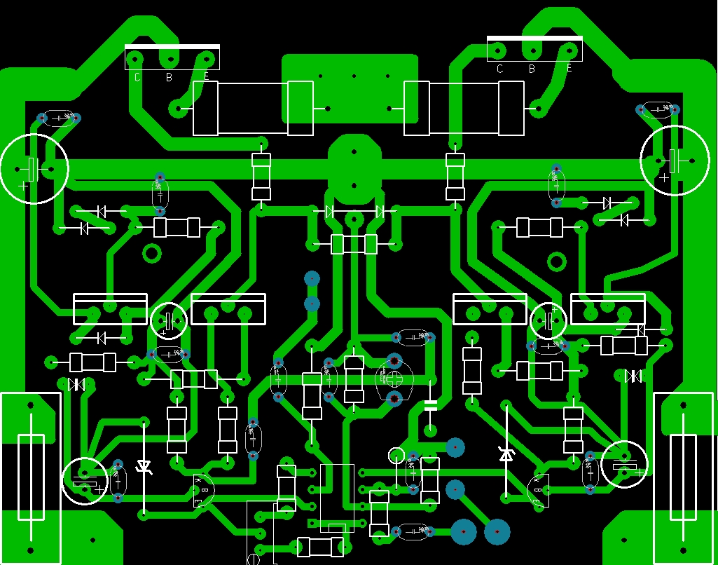 Vadim 161, спасибо за проделанную работу, которую должен был сделать я, но надо было сначала послать мне в личку для проверки. Ошибки есть и много. Ведь на чертежах написано:- нижняя часть и верхняя часть, а получилось то, что Вы сделали, наоборот. Неправильно обозначена цоколёвка мощных выходных транзисторов ( хотя это мелочь и совсем не нужно). Не совсем симметрично электролиты 470 мк. по питанию и детали стабилизаторов по + по -, ещё не закончены линии соединений. А Вы можете позвонить мне на Skype, поговорили бы.