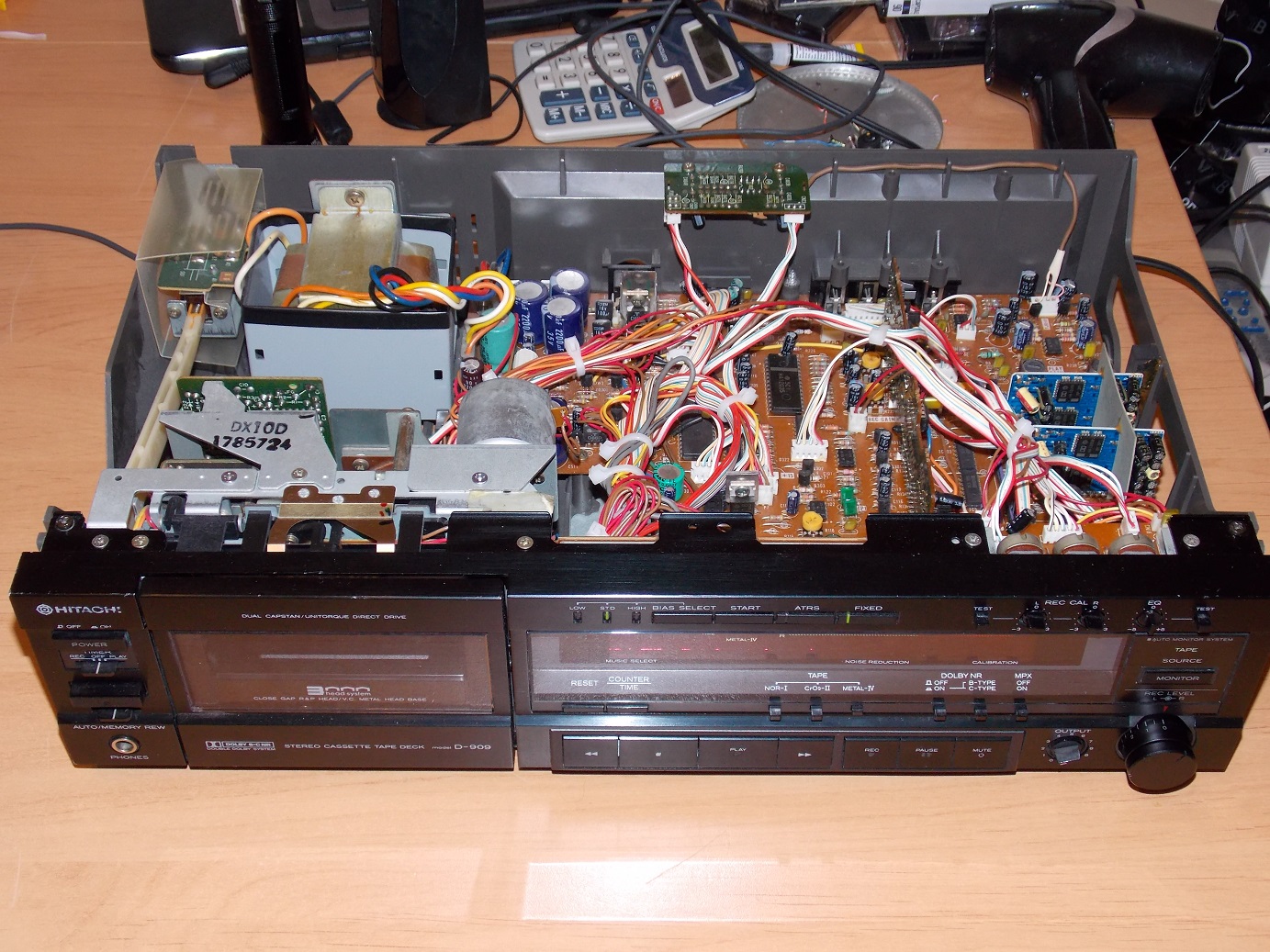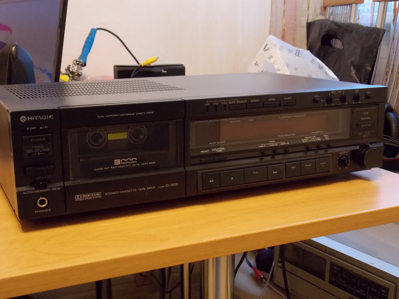 Бегло взглянув на аппарат и увидев надпись на передней панели о наличии закрытого тракта и трех головах, подумал, что это какая-то простенькая трехголовая дека Корпус пластиковый, вид невзрачный. Первое, что насторожило, когда открыл крышку - это прямой привод правого капстана и большая черная ферритовая голова. Посмотрел в Интернете - оказалось, что это топовая модель 1985 года, практически "вершина" творчества инженеров Hitachi Просто, на нормальный корпус средств не хватило, видимо.