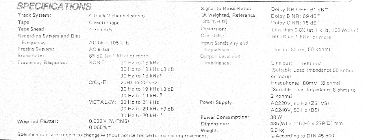 Первое, что бросилось в глаза - это правое расположение кассетоприемника, а также огромной глубины прочный и тяжелый корпус. Более детальное знакомство выявило достаточно серьезную оснащенность дек - автоматическая калибровка на ленту, запись и воспроизведение на 4 типа лент, автоматическое определение Cr или Fe (они на одной позиции переключателя), возможность автоматической установки уровня записи, компандерные системы шумопонижения ANRS и Super ANRS - типа, как Dolby B и C. Деки имеют микрофонные входы, довольно приличный встроенный усилитель для наушников, стрелочные индикаторы среднего уровня и пиковые светодиодные, счетчик ленты с памятью и автоматическим включением воспроизведения - оказалось очень удобная штука при настройке двухголовой деки