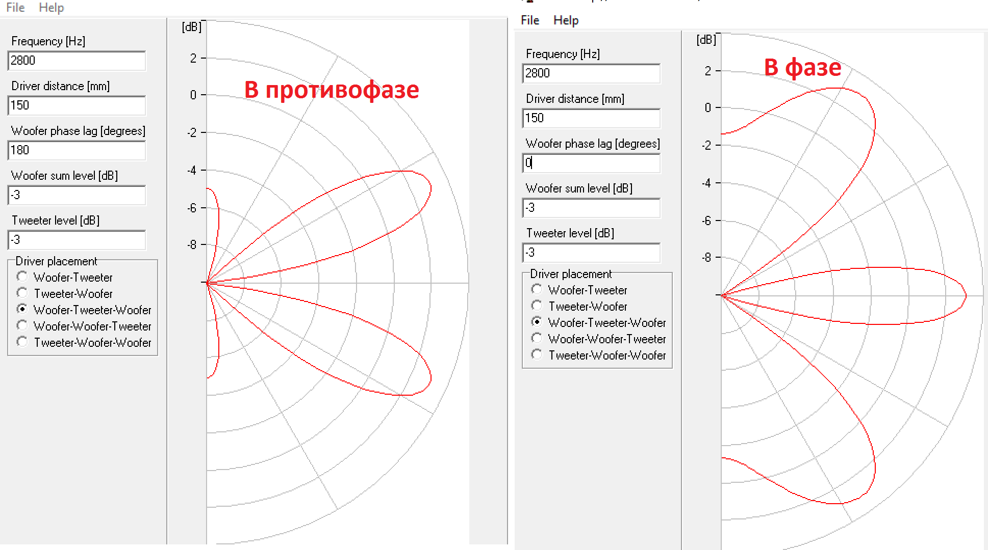 В двух случаях - с синфазной фазировкой и противофазной фазировкой.