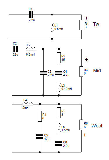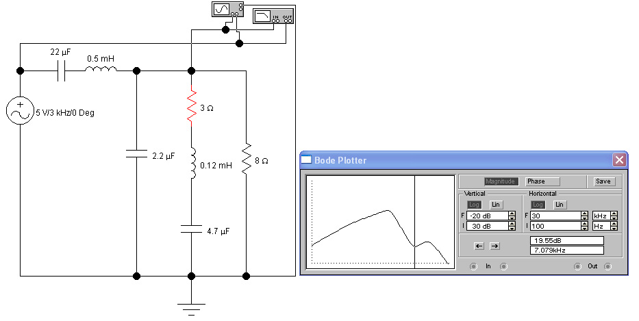 Посмотри, как EWB видит твои фильтры. Особо обрати внимание на фильтр СЧ головки. Эти картинки близки к истине, хоть не учитывают индуктивность динамиков (но её, имхо, и нельзя учитывать напрямую, поскольку от неё при работе идёт отбор энергии). Они могут помочь тебе понять причину своеобразного звука на средних частотах. Ещё обрати внимание на влияние RC-цепочки на ход АЧХ НЧ динамика. При её наличии, нельзя считать порядок этого фильтра первым. Также полюбопытствуй, как работает твой режектор, настроенный на 7 кГц.