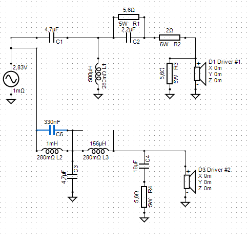 Кроссовер малочувствителен к некоторым номиналам. Ёмкость 18 мкФ, в частности, в проекте была 15 мкФ. Ёмкости 4,7 мкФ были 5,6 мкФ. Для меня осталось загадкой, почему, в итоге, ВЧ пришлось включить так как он обозначен в схеме. В проекте он был посчитан инверсно. А в конечном итоге его пришлось припаять согласно, чтобы получить совпадение АЧХ, согласно измерениям.