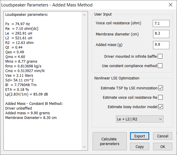 Я их не измерял (доверился параметрам указанным китайцами на картинке в карточке товара, сейчас нет этой картинки). Корпуса были сделаны под другие динамики. Параметры динамиков, по которым были рассчитаны корпуса не совпали (именитый бренд, кстати и проверенный магазин аудио-хи.фи) и я уже не измерял параметры Т-С. Просто поставил и измерил в ближнем поле микрофоном. Результат устроил с натяжкой. Меня мало интересовал НЧ диапазон, интересно было свести ВЧ-СЧ. Сейчас едут ещё пара 4 дюйма и пара 5 дюймов. Вот их буду мерить. Должны приехать до НГ.