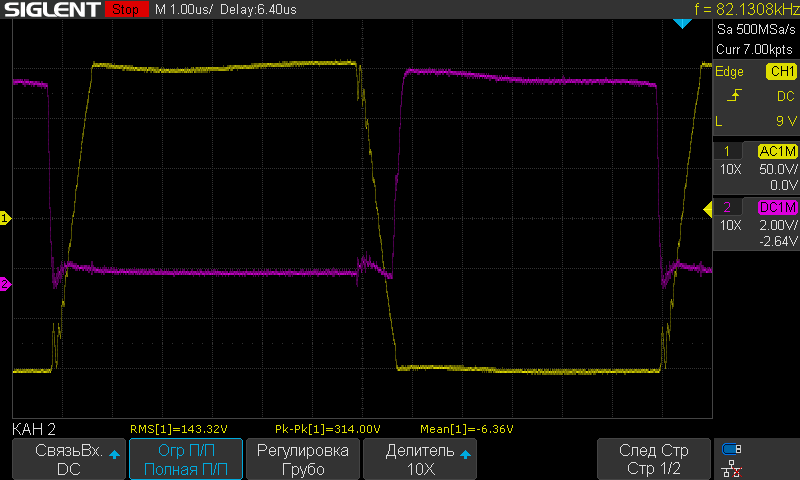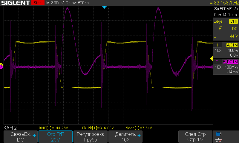 Важно, что ток в обмотке непрерывный, почти синус, без всплесков и иголок. Это хорошо, очень мало излучаемых помех. Надо бы ещё контур излучения переключаемого тока минимизировать. Я, например, располагал оба транзистора полумоста в силовом SO8 вплотную друг к другу и ставил развязку керамическими конденсаторами прямо около выводов, а тепло с платы отводил через мягкую силиконовую прокладку поверх транзисторов.