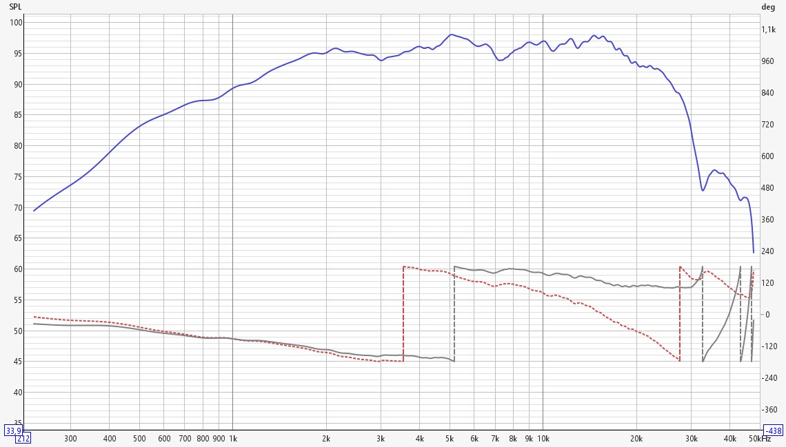 Она была бы справедливой, еслиб не одно НО - динамик не мгновенно начинает движение и есть некоторое значение глубины так называемого акустического центра. У ВЧ динамиков он очень мал, у НЧ динамиков может быть на несколько сантиметров глубже как бы под пыльником. Логично, что у ВЧ динамика в рупоре акустический центр расположен примерно где-то в районе мембраны динамика, но измерения УСБ микрофоном нам никогда не скажут на сколько глубоко и какая разница этих акустических центров между ВЧ и НЧ динамиками, оба измерения будут иметь вид похожий на чёрный график, даже если один из динамиков будет на 1 метр дальше. Измериловка в силу её одноканальности не умеет определять задержку динамик - микрофон.