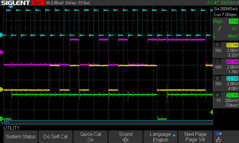 Сверху вниз: sck, data left, data right, latch. Конфигурация на 16 бит.