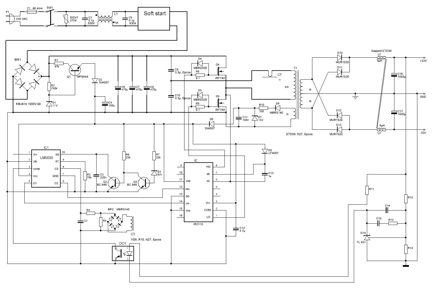 Давно почитываю сей форум, и вот надумал слепить собственный импульсник для усилов. Это полумостовая стабилизированная схема на LM5030 и IR2110, есть ограничения по току, мягкий запуск. Надо еще допроектировать обратную связь и посчитать трансформатор.