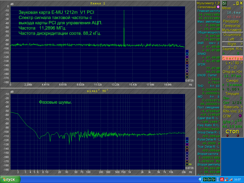 При измерениях спектров на спектрограмме были спуры и уровень шумов выше на 7-8 дБ чем в случае измерения сигналов с картой версии V2. Решил проверить ФШ кварцевых генераторов версий V1 и V2 звуковых карт , уровни шумов были практически одинаковыми. Проверил ФШ на контактах микросхемы ПЛИС карты версии V1 где сформированы сигналы для управления АЦП. Оказалось, что уровни ФШ с выхода ПЛИС на 37 дБ выше чем непосредственно с выхода тактового генератора. Причиной ненормально высокого уровня шумовой дорожки на спектрах оказались шумы микросхемы ПЛИС.