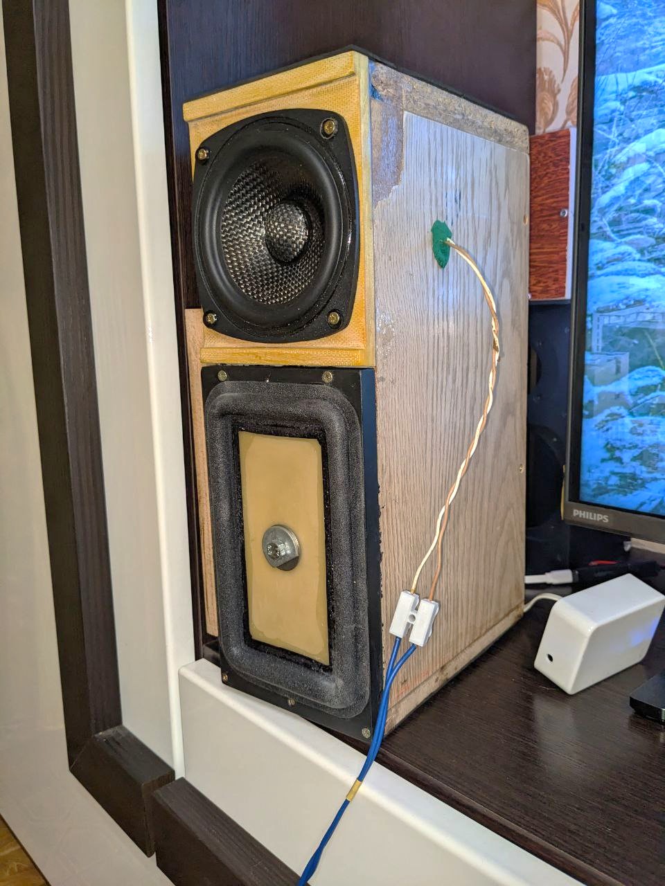 Материал 16мм (мдф), наружные размеры 144x224x192, фазоинвертор щелевой (10x112мм), вдоль верхней и задней стенок, изнутри не доходит до пищалки на 1см. Сзади в образовавшейся пазухе установлен такой вот клеммник https://www.ozon.ru/product/kolodka-...ki-1656224505/, т.е. высота проема составляет 45мм.