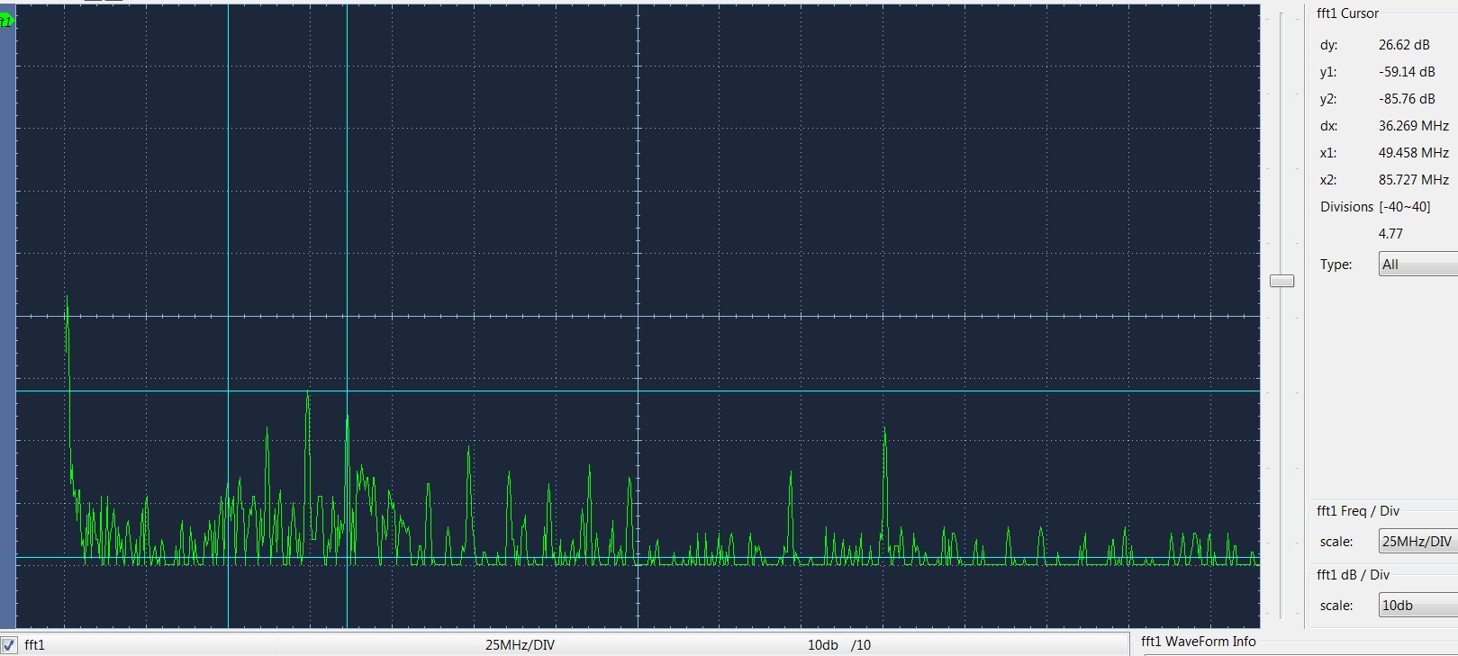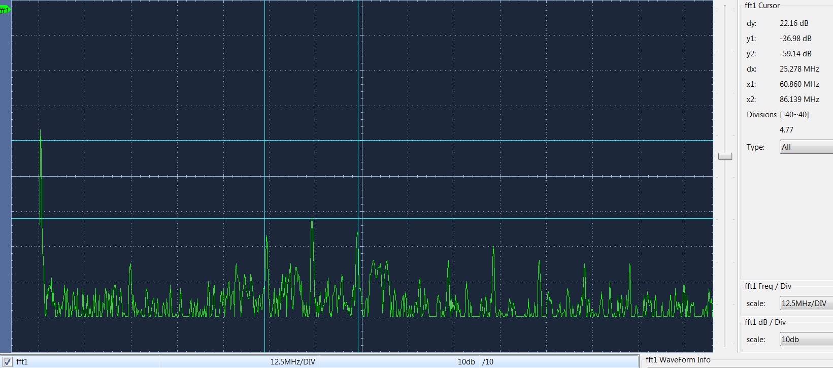 Следующий спектр 25МГц на клетку, зв. карта воспроизводит сигнал 18+90кГц; последний спектр 12,5МГц на клетку, зв. карта воспроизводит сигнал белый шум. Частоты можно оценить по синим меткам (справа х1, х2).