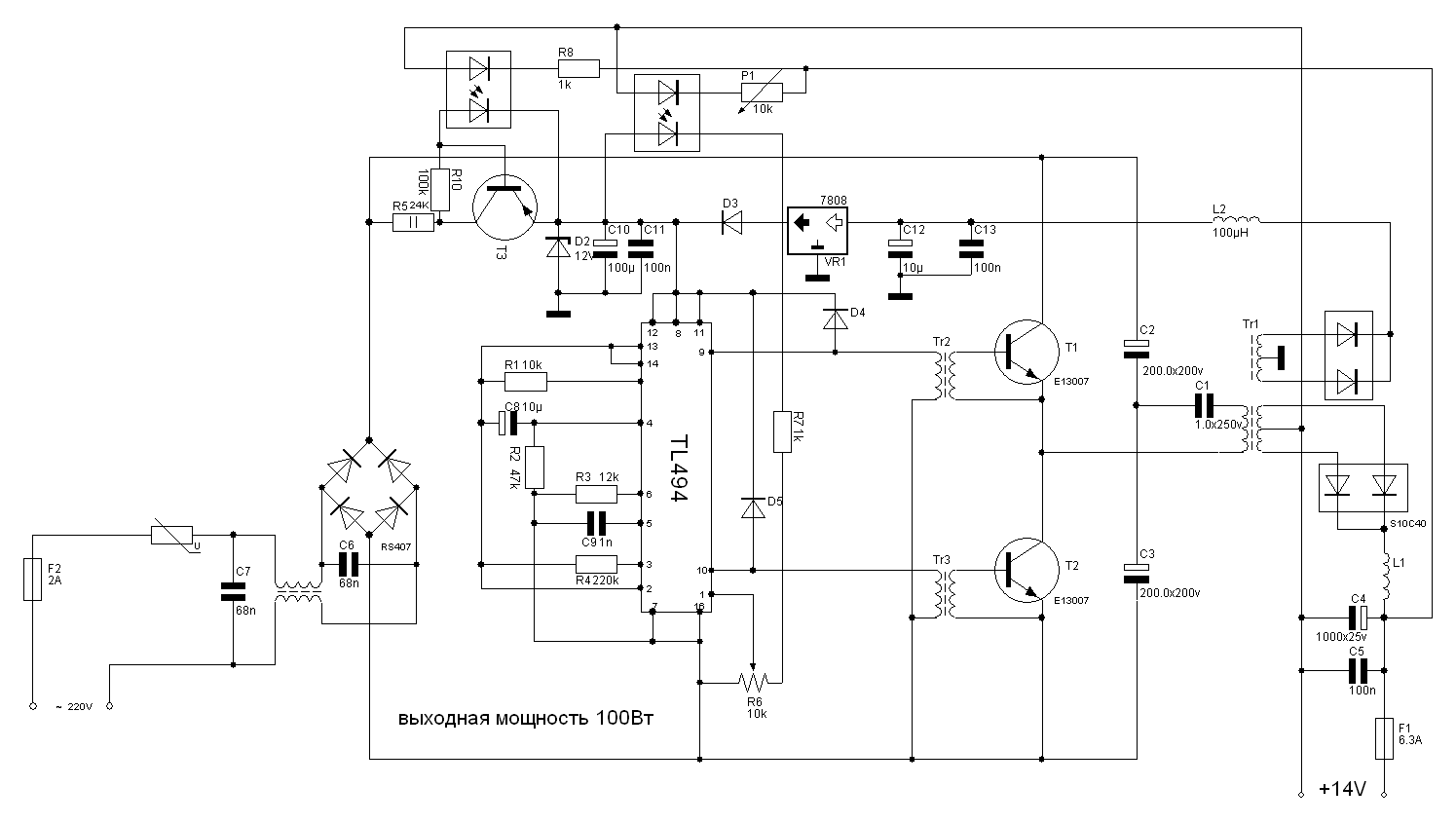 привет всем, я тут за вечерок схемку набросал, источник на 14В, 5А, для сверлилки для плат и возможно для зарядки аккумулятора, прошу вас взглянуть на схему опытным взглядом, ваши советы сберегут мне нервы, а возможно и транзисторы а также надеюсь мне непридётся переделывать плату по сто раз...