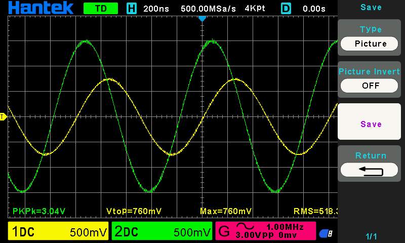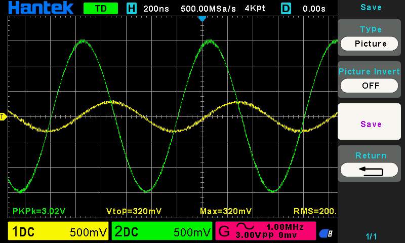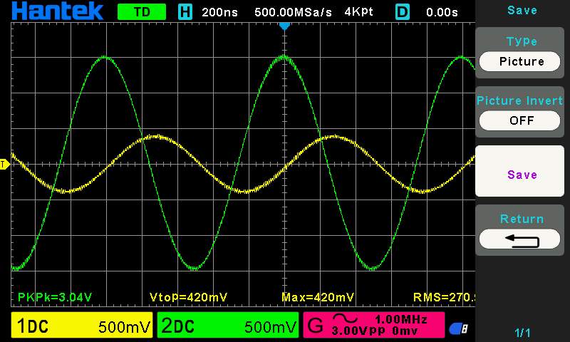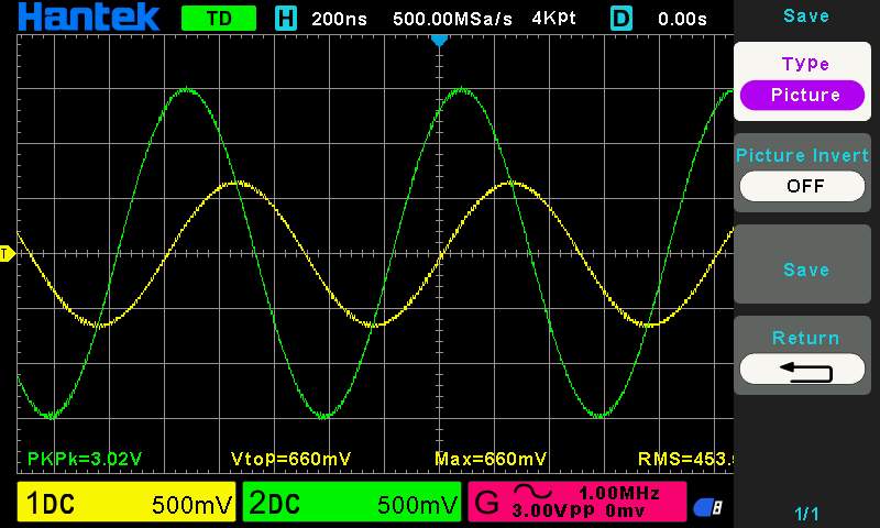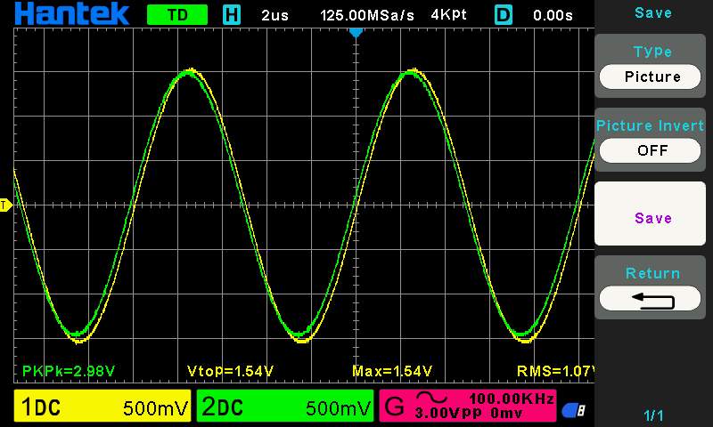 Погонял на синусе 100кГц и 1Мег, лопухнулся с синхронизацией, осталась по выходу, желтый луч, надо было по входу (зеленый), было бы понятней. Еще момент, на входе стоит делитель 100 Ом 10к, и в ООС так-же 100/10к, усиление получается 101. Но все равно странно что иногда выход превышает вход, причем заметно.