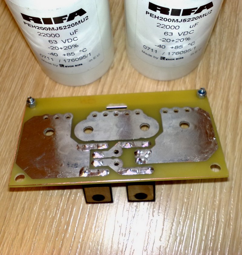 У шотток ПОС по температуре, не охота для них радиатор городить. В общем я сегодня все расчертил, 120000 мкф (по одной Рифе 22000х63 в плечо, остальное все на плате) на два канала по 200вт у меня влезает.