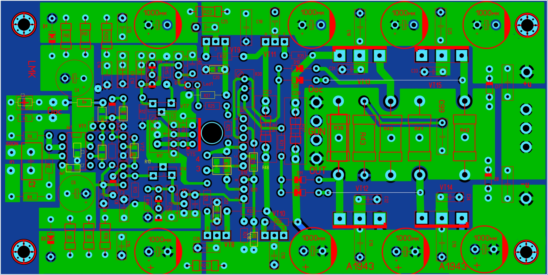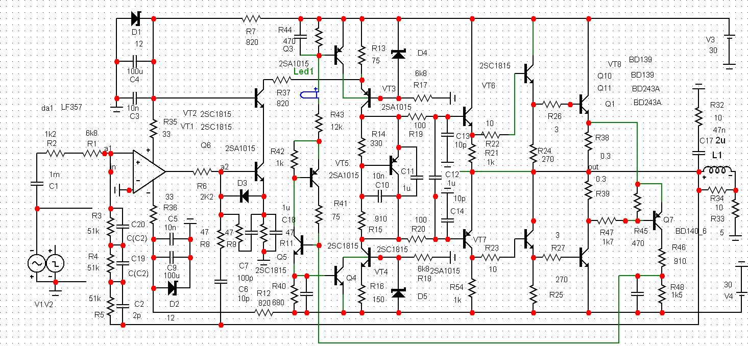 Посмотрел возможность работы усилителя с квазикомплементарным выходом. Весьма неплохо , радиаторов много под 808 транзисторы выпущено,да и старые усилки можно апгреить тогда .А если использовать импортные составные или наши кт827, то схема упростится д