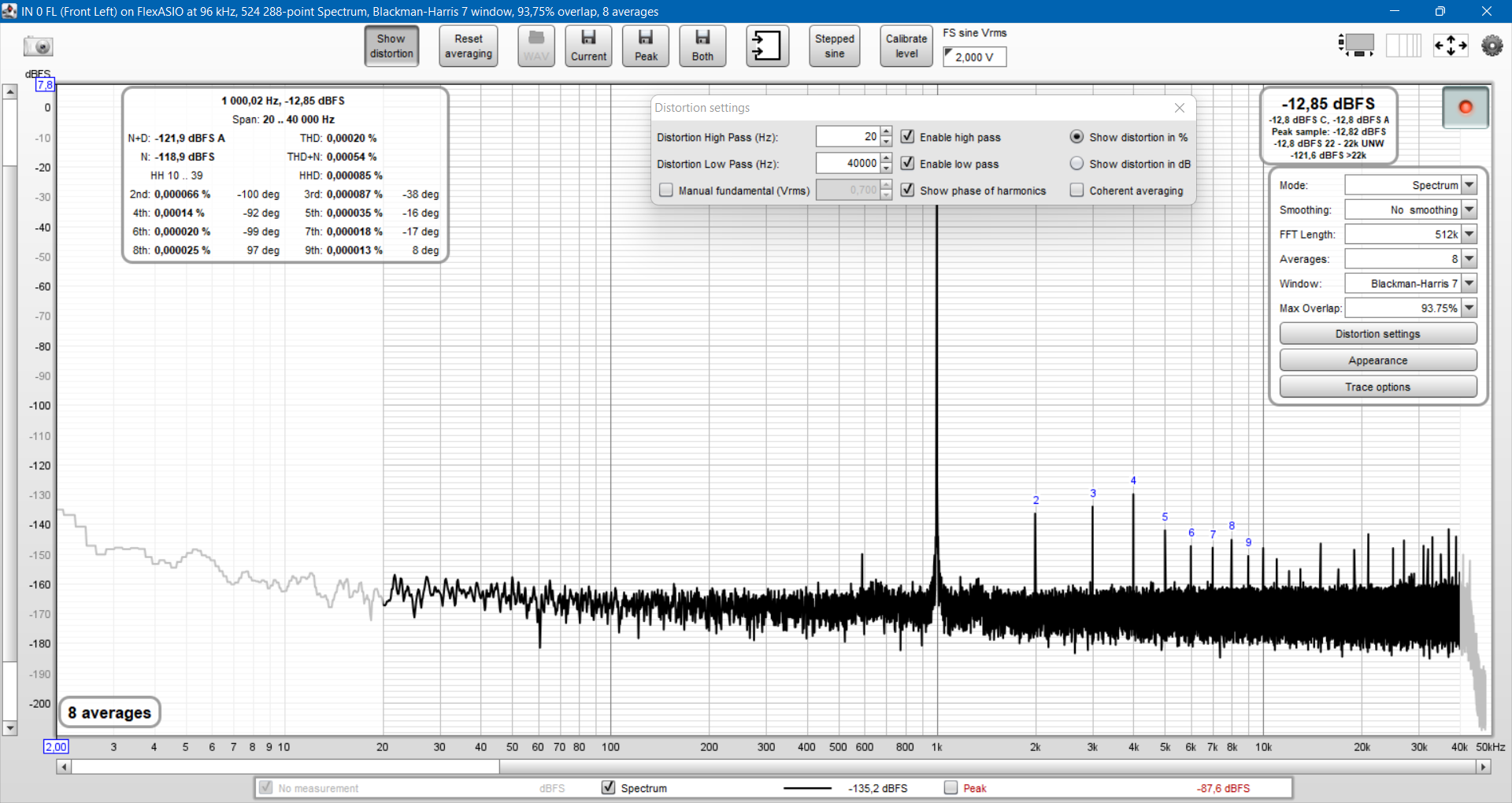В этих условиях калибровки, я вижу -138дб 3ю в среднем, порядка -145дб 2ю, остальные часто -145 и ниже, голый THD почти в 100% .2РРМ, бывают редкости как с .3РРМ, так и с .1РРМ. THD+N под -124дб для грэйд-А, под 125дб для грэйд-0.