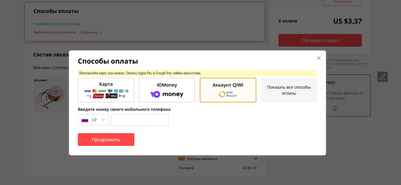 Но на Али киви-кошелёк вынесен отдельно (именно QIWI Wallet)