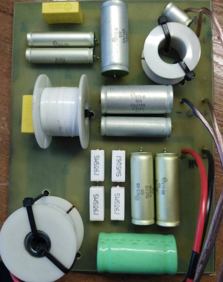 ID:	217783Теперь начинаем собирать (спаивать кроссовер) Я собирал на наших отечественных конденсаторах К73-16 и МБГО, резисторы я использовал на 10 Ом с подстройкой так как не нашел в магазине на 5.6 Ом.