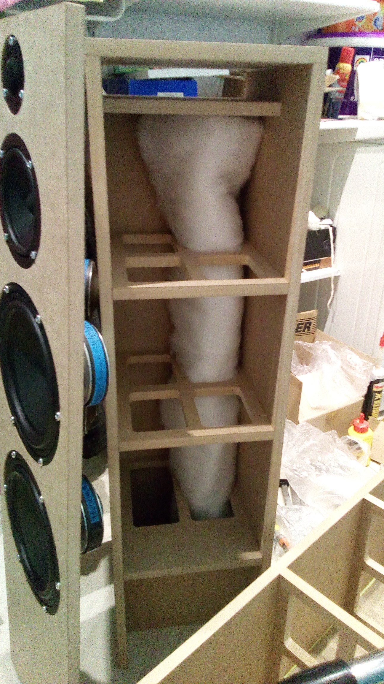 Теперь вопрос по СЧ/ВЧ секции. Когда клеил перегородку - промахнулся и теперь от неё до передней панели 72 мм, т.е. до магнита сч-динамика не 20 мм, а 30. Не страшно? В ВЧ/СЧ бокс идеально укладывается мой синтепон в три слоя. Оставлять так или вклевать что-нибудь сантиметровое?