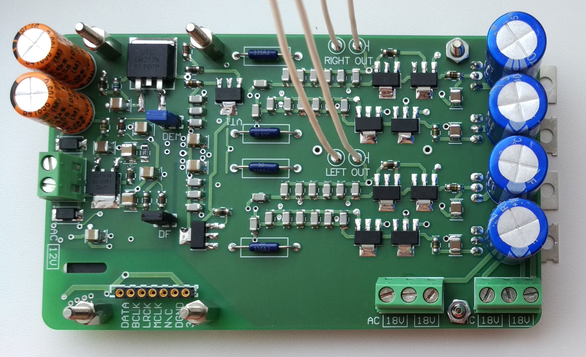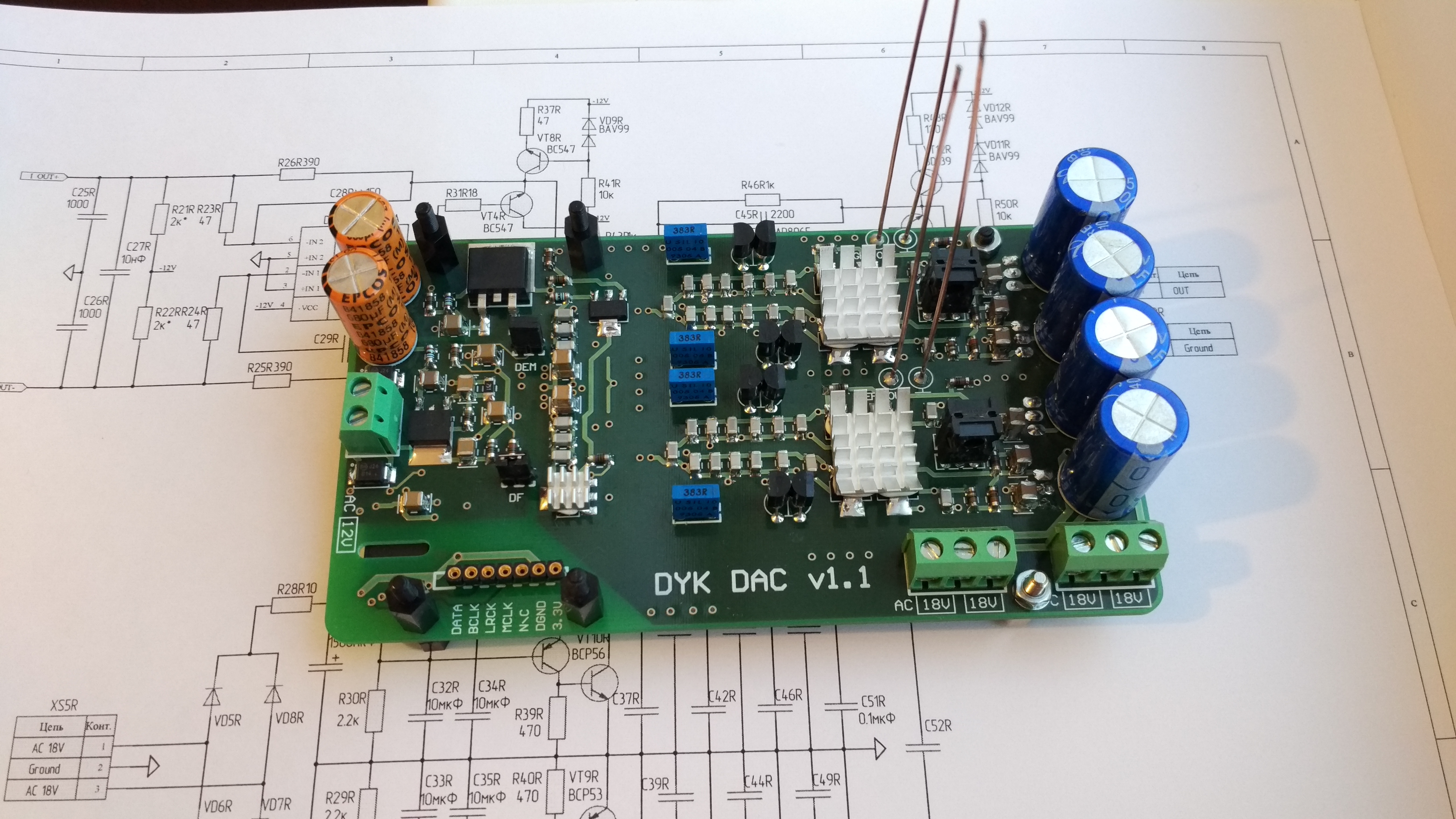 Запустил цап, звучит довольно приятно, ни какого клипа нет, сравниваю с D47, звук точно разный, пока не могу описать разницу надо послушать, при 0дб тестового сигнала на выходе DYK DAK-а 2.11вольт у D47 2.71вольт.