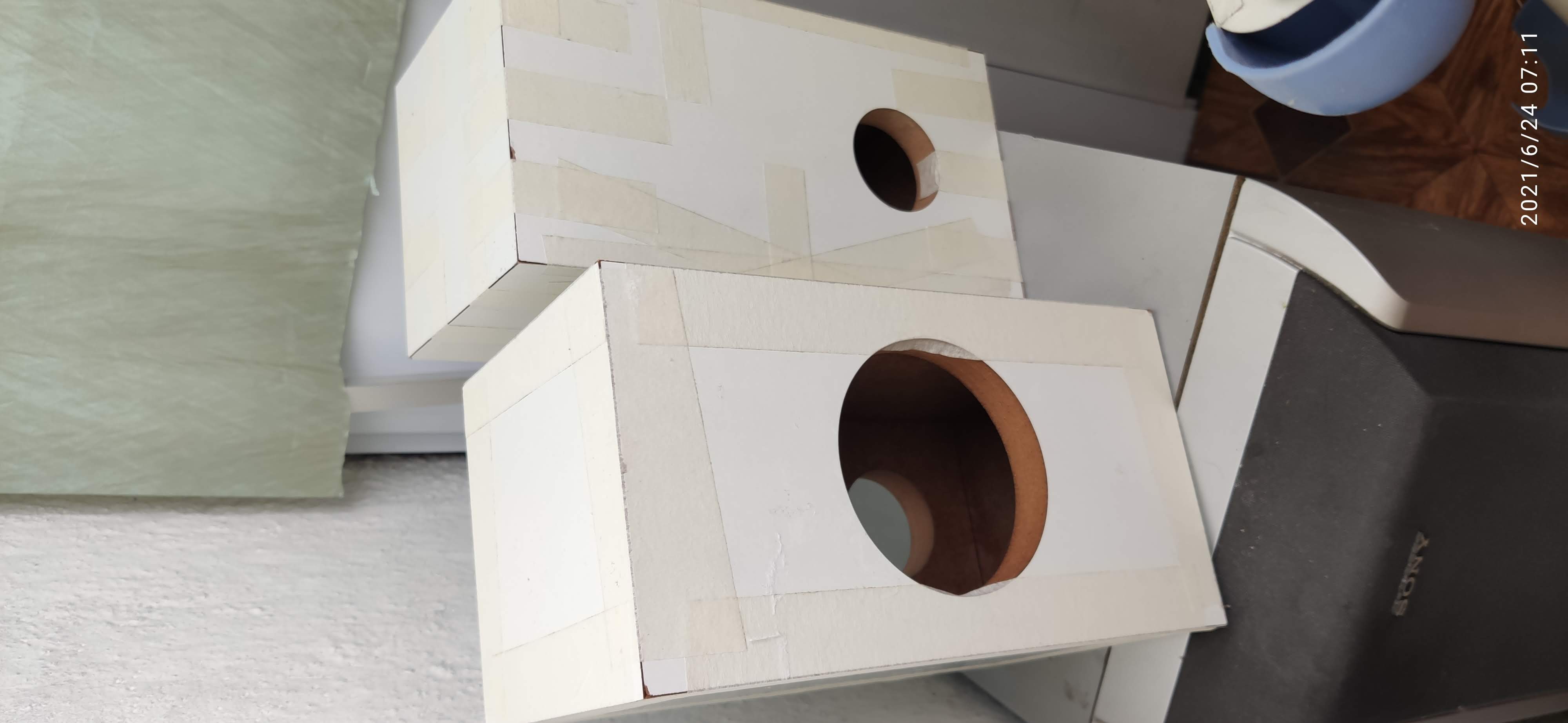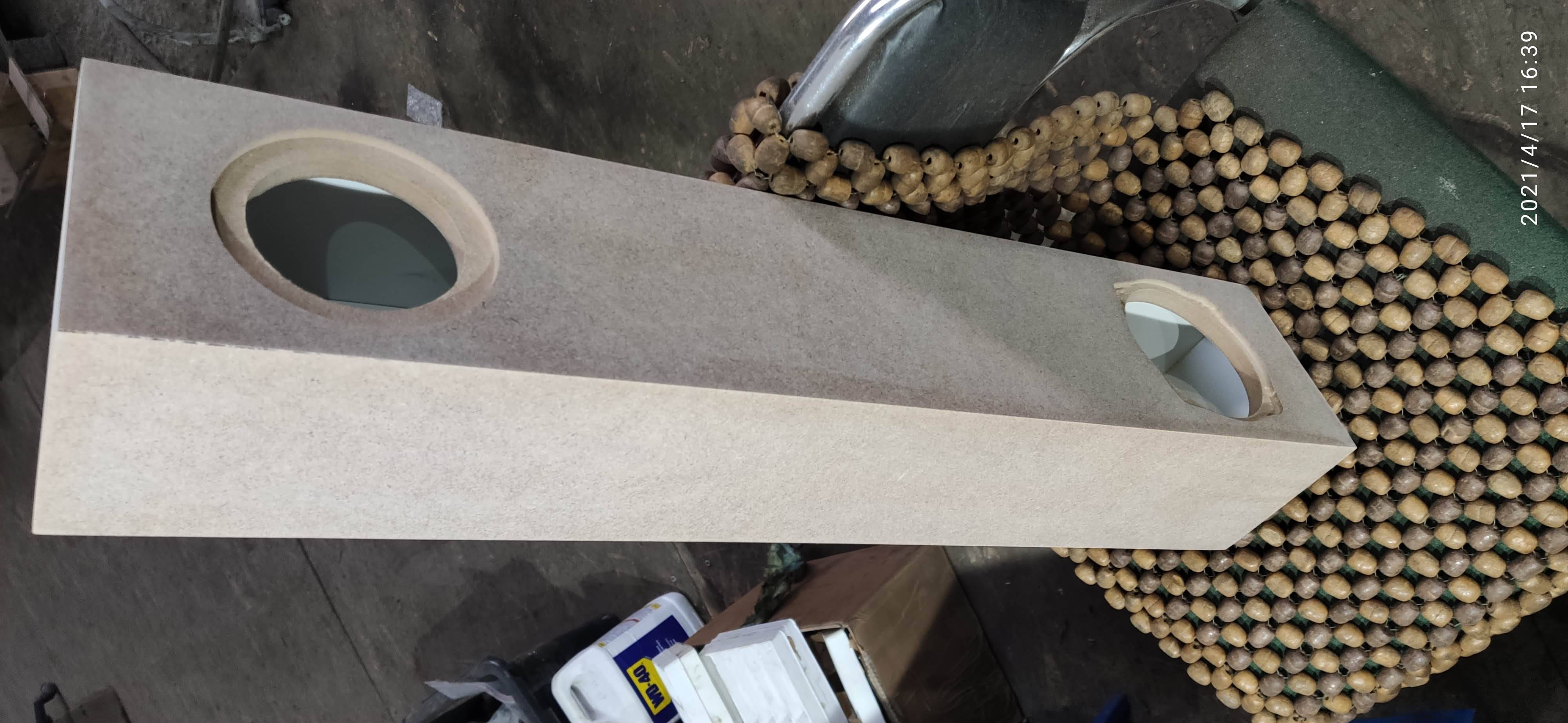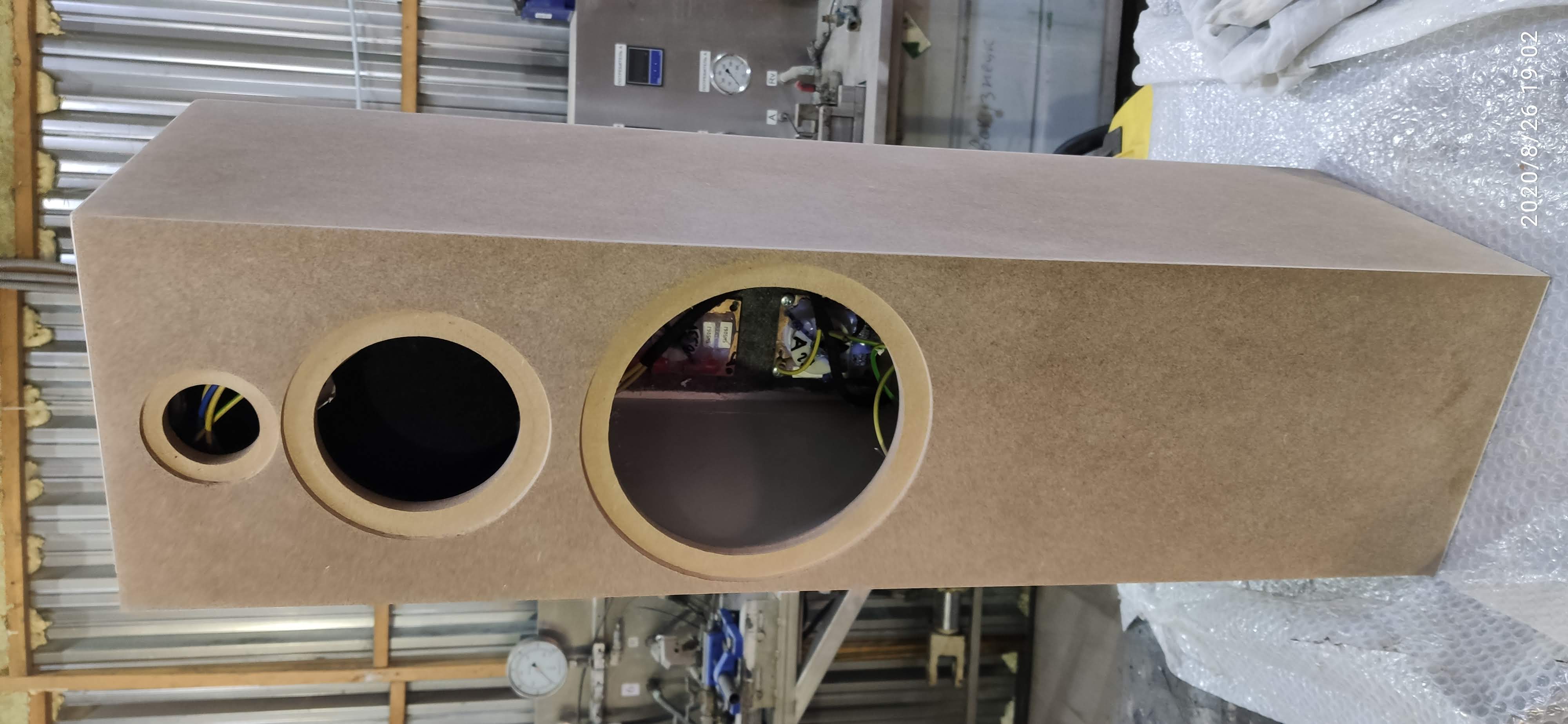 При расчете акустического оформления низкочастотного динамика B2006.8 (B2006.2.8) за базовые характеристики были взяты параметры: номинальная мощность 40вт, линейный ход 5мм на сторону и средние измеренные электромеханические параметры партии динамиков. Для сохранения линейного хода на номинальной мощности потребовался ящик объемом 35литров с фазоинвертором площадью около 65см2 с настройкой 35Гц. В основном объеме необходимо расположить 130грамм синтепона и в объеме среднечастотного динамика МР1344.1.8 50грамм синтепона. Корпус изготовлен из 16мм МДФ.