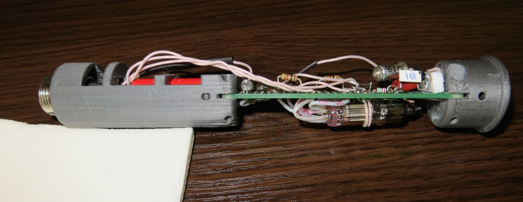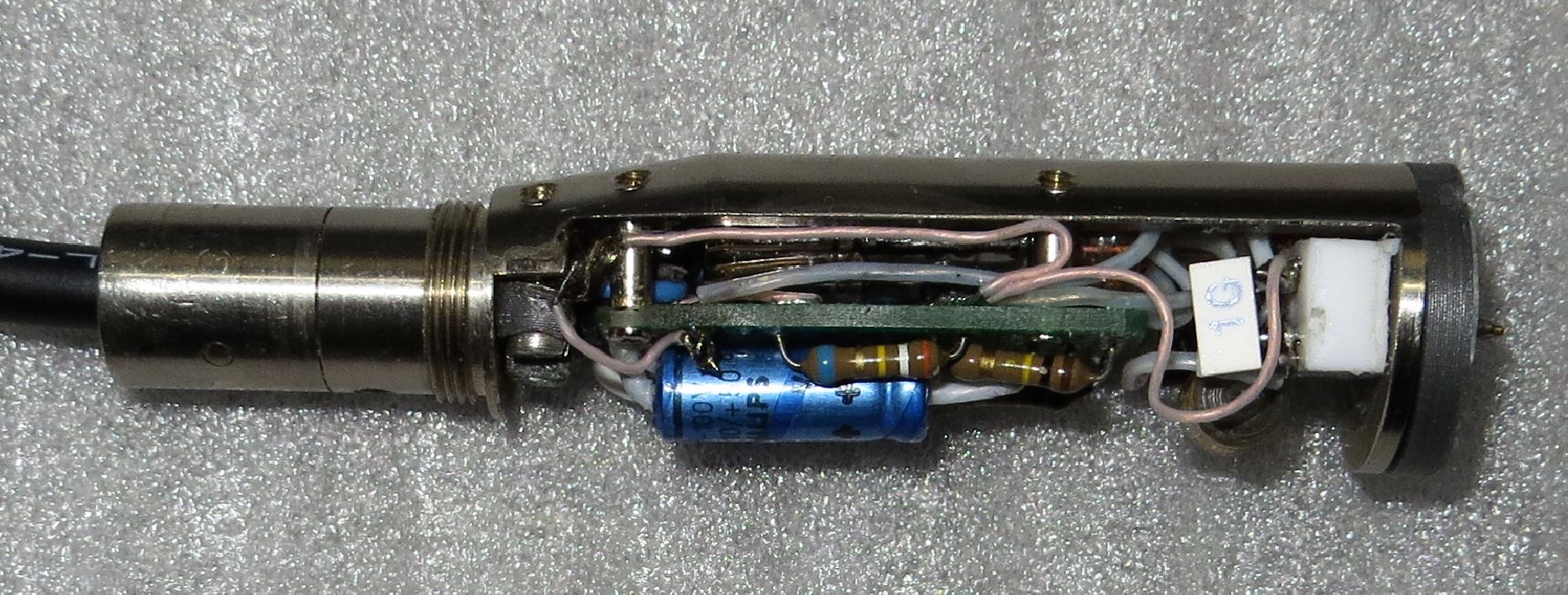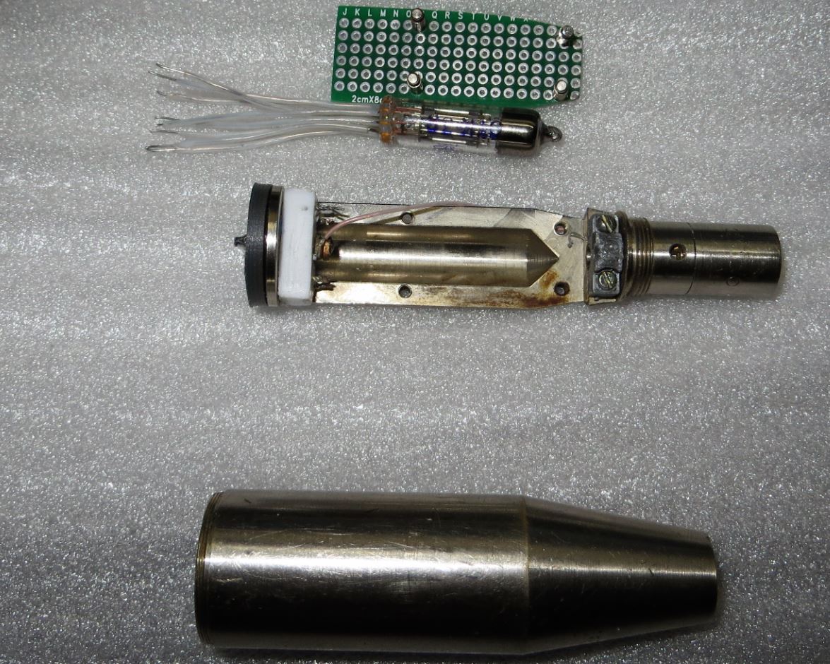 Сижу починяю убитый в хлам микрофон. Удалось получить какой то звук - СПАСИБО Aikman за схему. Мне просто удовольствие доставляет с ним повозиться ........ Корпус нравится, лампа нравится, но для микрофона ........ не понятно подходит или нет. Я на такой лампе раньше микрофонов не пытал и не делал ..... Хотя на ней есть достаточно много промышленных микрофонов ......... В данном приложении мне такой конструктив не нравится. Корпус микрофона очень нравится. Детальки и схема не нравится.