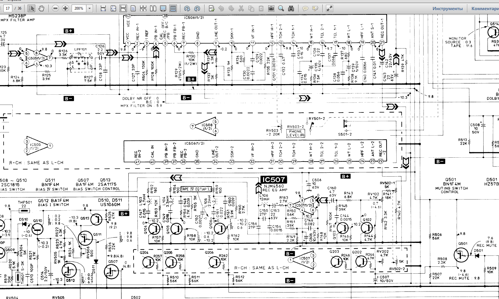 Собственно вот- ic507 только там не 4560 а через переходник две 5534.Операционники подают сигнал на записывающую головку магнитофона. Полярность перед операционником должна меняться как я понял, а после операционника?