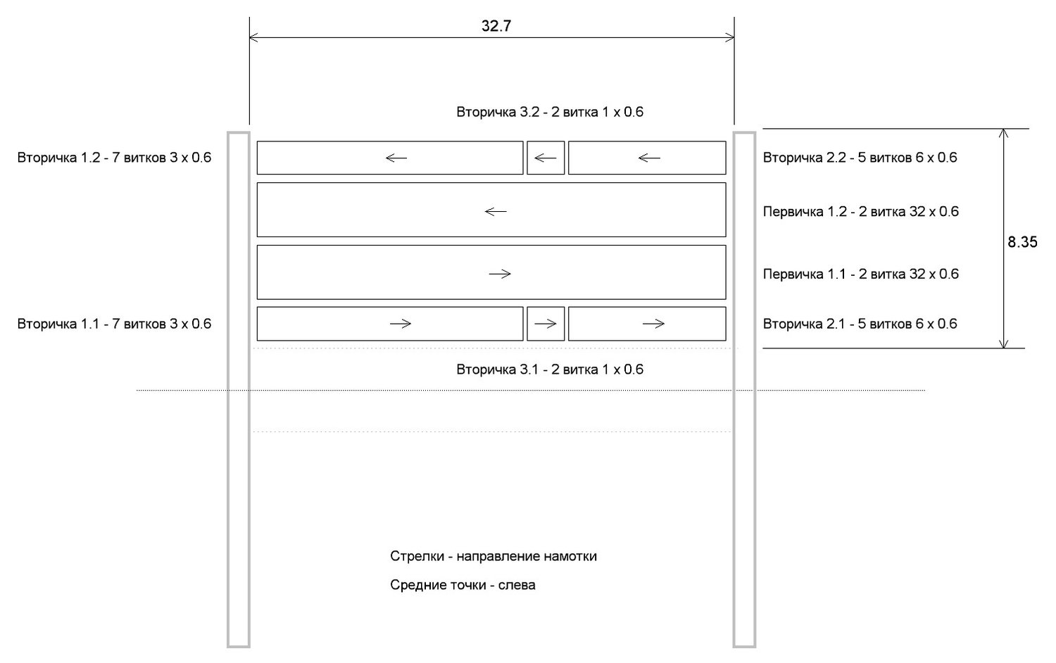 3. Мотаю в ту же сторону первую половину первички. Первичку придется плющить чтобы распределилась равномерно по всей