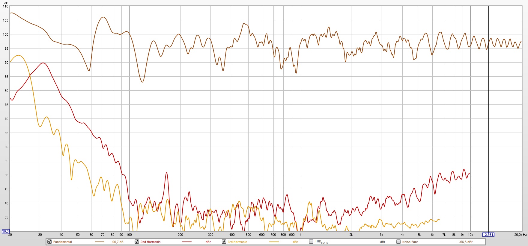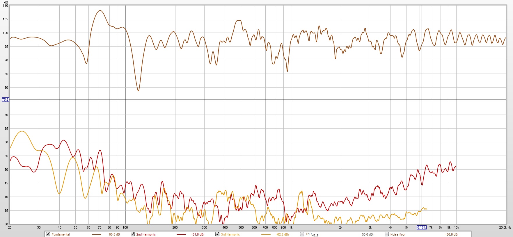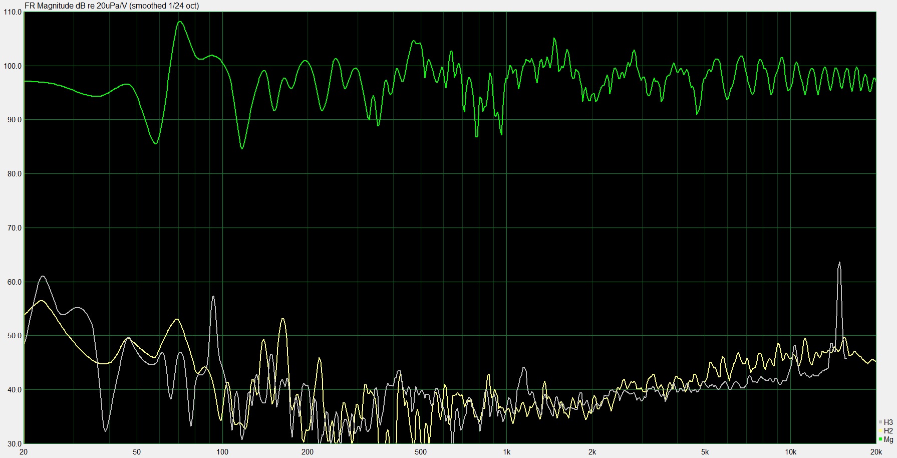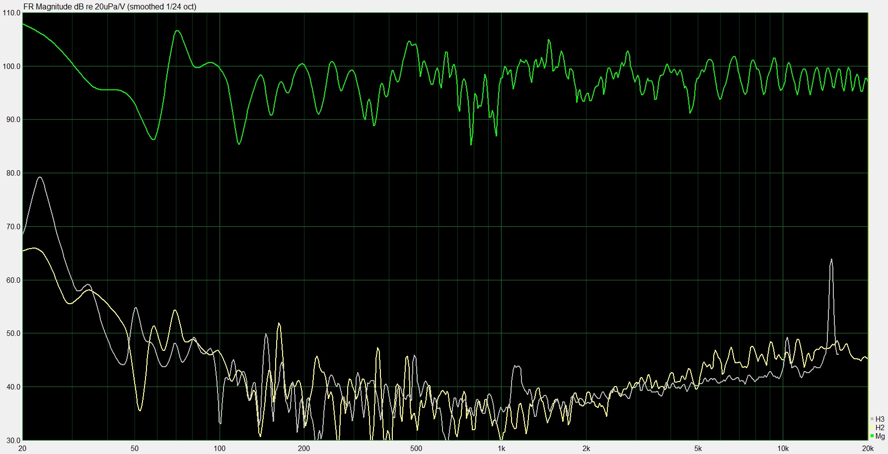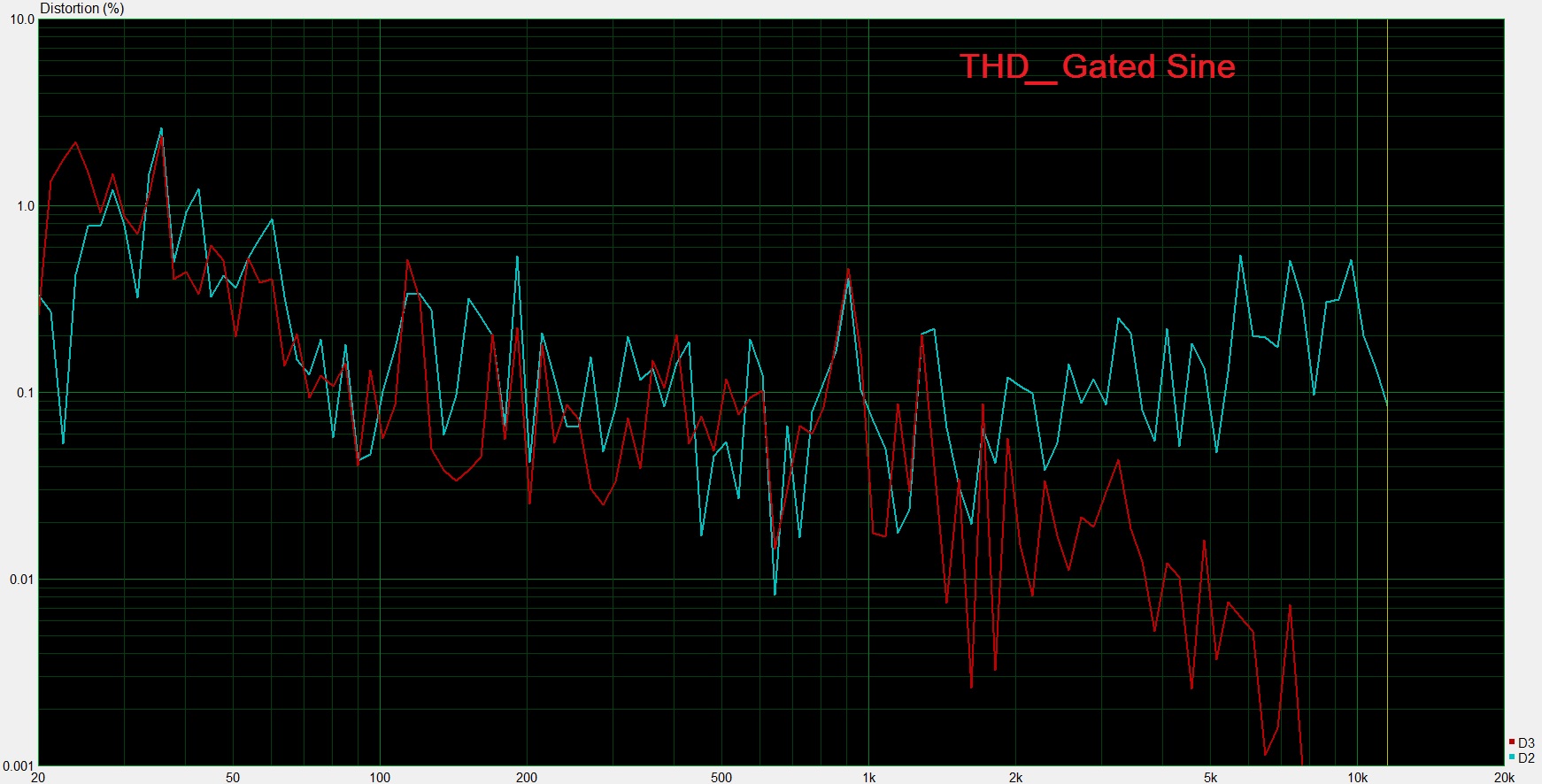 За сим вывод - измерения искажений нужно проводить с наименьшим кол-вом отражений и лучше всего Gated Sine, т.е. подачей синусоидальных сигналов с шагом. По аналогии - автоматическим спектрозахватчиком с его конвертацией в график. В Arta это Steps, в LSP LAB3.0 в настройках Gated Sine Wave. В Rew не копал. Положил картинку в %, но она не особо читаемая, т.к. на ней много отражений.