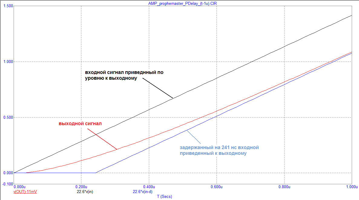 вид задержки при соизмеримых сигналах в двух моделях усилителей.