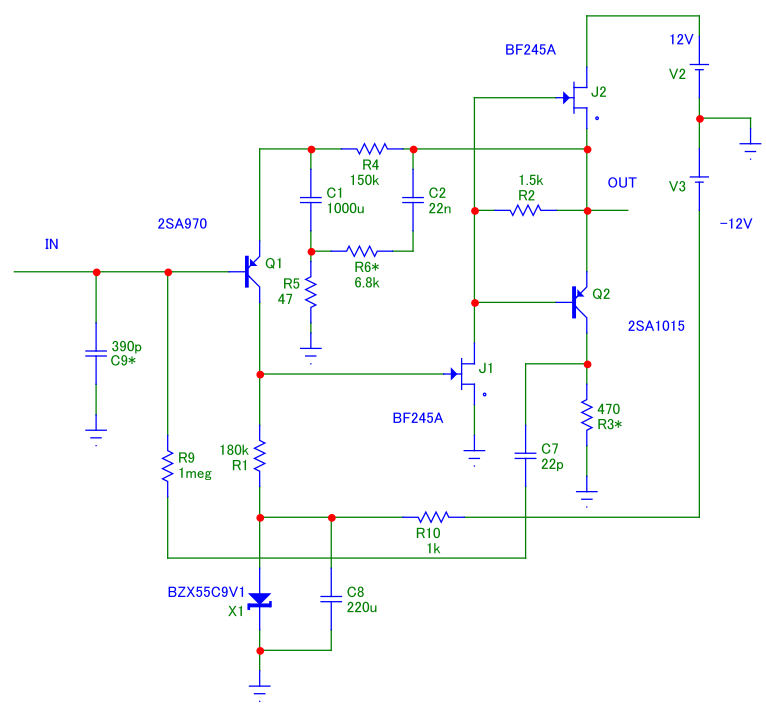 Простейший RC фильтр по питанию не показан. Коррекция АЧХ на ВЧ осуществляется настройкой входного контура на частоту 25-27 кГц конденсатором С9 и демпфированием входного резонанса "охлажденным" R9. АЧХ на ВЧ подстраивается подбором R3 - меняется добротность входного контура.