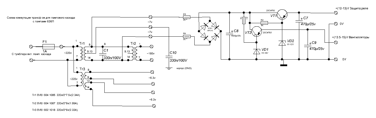 Для накала использовал ТАН1 у него 4е обмотки на 6,3В. Для анодного транс от ВК кадровой, от ламповых чёрно белых ТВ, изменив вторичку.