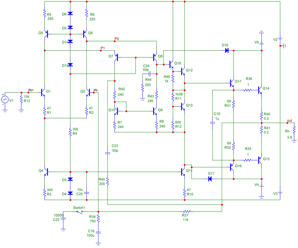 Интересно - а какое усиление сигнала может быть в точках Р1 и Р2, если на эти точки нагружены эмиттеры Q7 и Q8 - там усиление по напряжению гораздо меньше единицы. Вячеслав