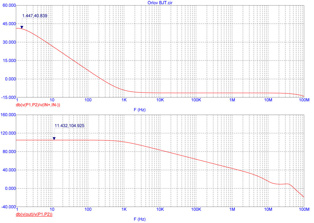 Посмотрел. Второй диф. каскад УН даёт 105 дБ усиления (график снизу). Остальное усиление за счёт первого ДК (график сверху).