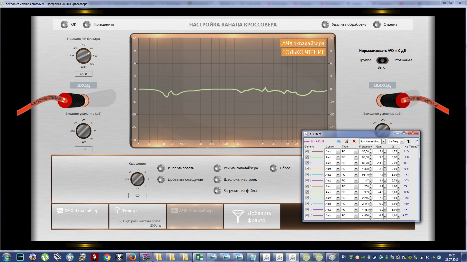 - амплитудный и фазовый эквалайзер для произвольного изменения АЧХ или ФЧХ в канале обработки, с возможностью загрузки АЧХ или ФЧХ из текстового файла или из импульсного отклика в формате WAV