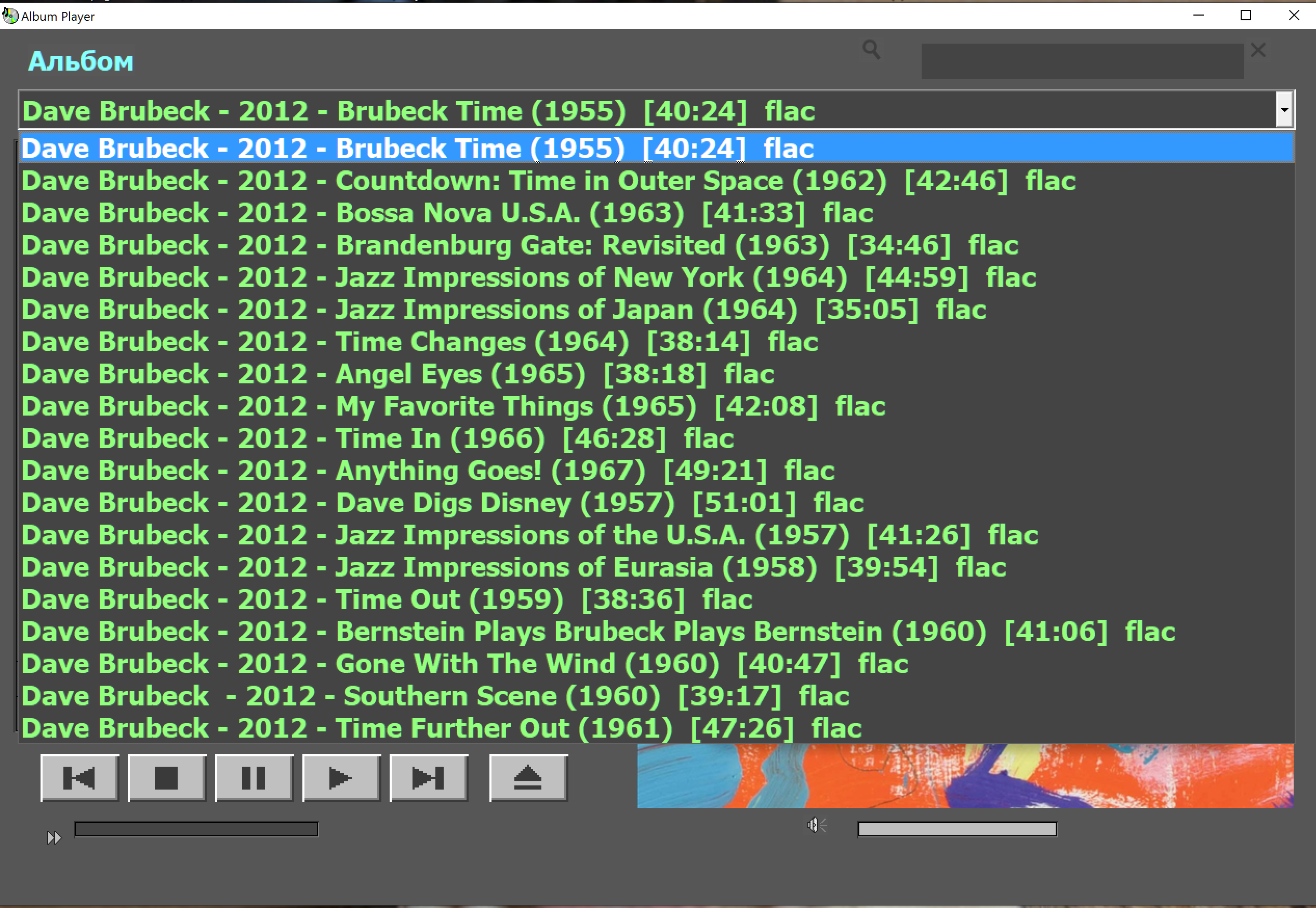 Album Player 2.3 (APlayer) предназначен для составления и прослушивания сборников музыкальных альбомов на жестком диске или на CD/DVD. Плеер воспроизводит основные типы аудиофайлов, для которых существуют plug-in модули в формате программы Winamp (MP3, APE, FLAC, Audio-CD и т.д.). При формировании плейлистов для образов дисков используется информация из .cue файлов.